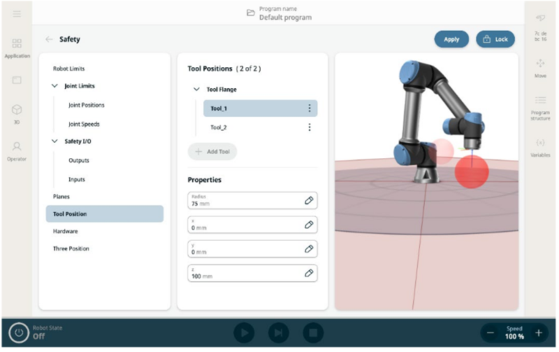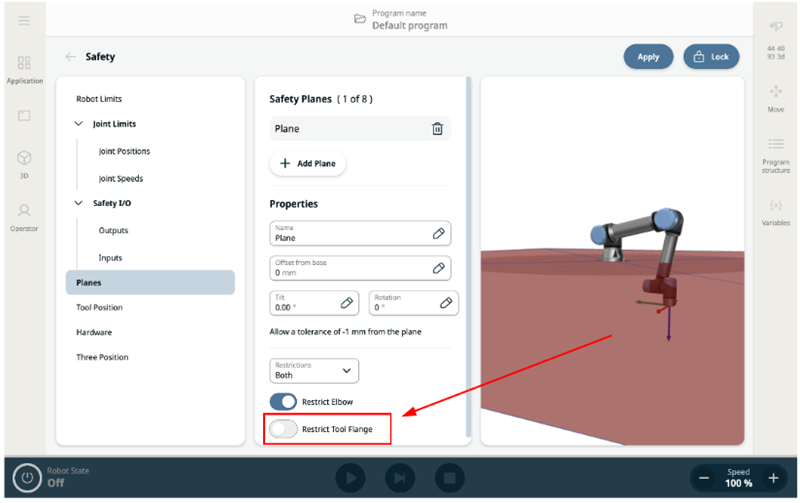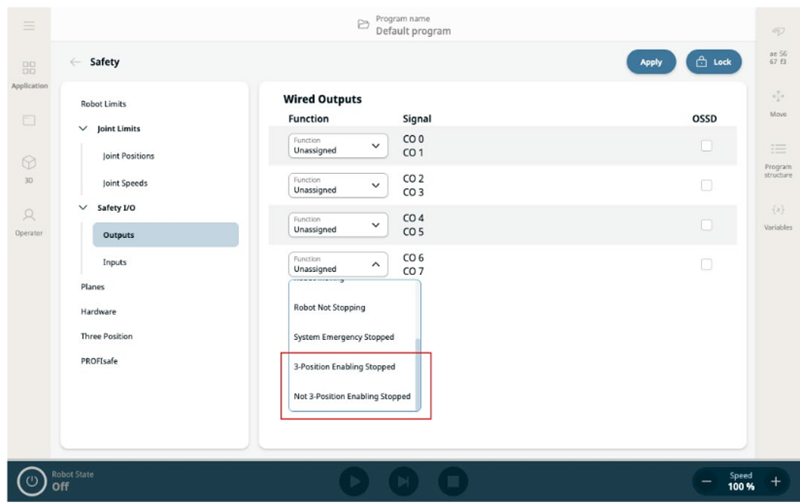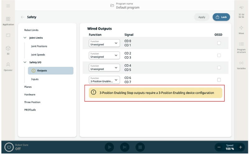 - Fixed issue where, in some situations, a Safety Function assigned to an output signal pair would be falsely removed on the Safety I/O > Outputs on the Safety application screen.